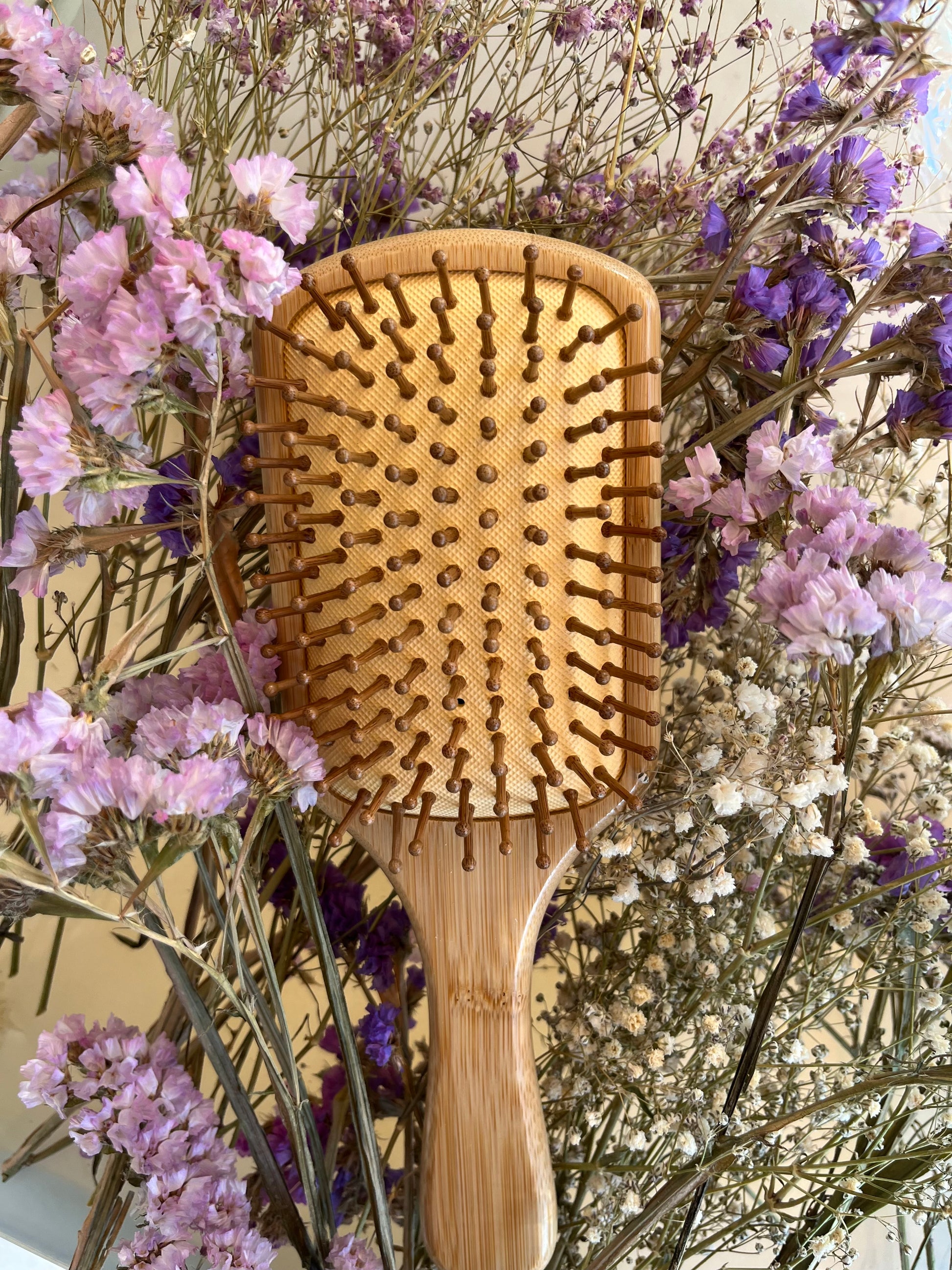 Découvrez notre Brosse Rectangulaire en Bambou, conçue pour convenir à tous les types de cheveux.